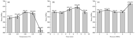 The tensile strength under different hot-pressing parameters is shown in Figure 10. The tensile strength of the samples increases and then decreases with the increase in hot-pressing temperature and time. In Figure 10a, the maximum strength is at 130 °C, reaching 595.43 MPa, while the minimum is at 140 °C, at 424.06 MPa; this represents a range of 171.37 MPa, with the maximum value being 40.4% higher than the lowest. In Figure 10b, the maximum strength occurs at 7 min, at 643.30 MPa, and the minimum at 3 min, at 586.39 MPa; the range is 56.39 MPa, with the maximum value being 9.7% higher than the lowest. For Figure 10c, the tensile strength changes little within the 5–8 MPa range, with a significant increase evident only at 9 MPa. At this pressure, the maximum strength is 674.55 MPa, with the minimum at 7 MPa being 595.43 MPa; the range here is 79.12 MPa, with the maximum value being 13.3% higher than the lowest.