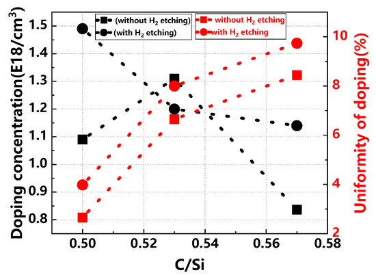 Figure 1 illustrates a comparison of the growth rate and thickness uniformity of buffer layers across various C/Si ratios, both with and without H2 etching. In the absence of H2 etching, the growth rate initially increases with the C/Si ratio before stabilizing due to a limitation imposed by the silicon source when the ratio exceeds 0.53. Conversely, with H2 etching, the growth rate first increases and then decreases as the C/Si ratio rises, exhibiting greater fluctuations and generally lower rates than those without etching. This decrease can be attributed to the effective removal of substrate defects by H2 etching, which also causes substrate depletion, impacting the buffer layer’s overall thickness and growth rate. Regarding thickness uniformity, it initially improves and then worsens without H2 etching as the C/Si ratio increases. With H2 etching, however, thickness uniformity shows a consistent linear decline, reflecting the etching’s influence in minimizing substrate surface quality variations, thus clarifying the relationship between thickness uniformity and the C/Si ratio [23,24]. Increasing the C/Si ratio facilitates the reaction between the carbon and silicon sources, thereby accelerating the epitaxial growth rate of SiC. However, excessively high C/Si ratios can induce surface morphology defects. Conversely, a lower C/Si ratio decelerates the growth rate due to a scarcity of the carbon source, and excessively low ratios may result in the formation of silicon droplets and pronounced surface steps. The C/Si ratio also has an important effect on the doping and doping uniformity of the buffer layer, and the specific trends are shown in Figure 2.