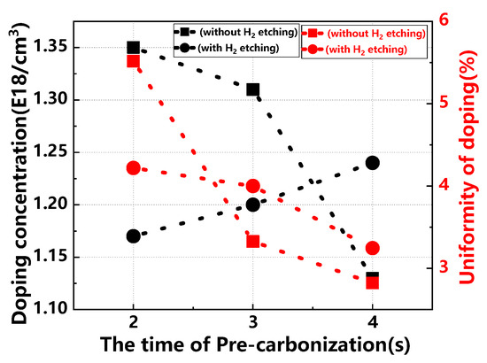Figure 5 illustrates how pre-carbonization times impact the doping concentration and uniformity in the buffer layer, with and without H2 etching. Without H2 etching, doping concentration decreases as pre-carbonization time increases. In contrast, with H2 etching, doping concentration consistently increases. Regarding doping uniformity, it improves with longer pre-carbonization times. Additionally, the introduction of H2 etching results in even greater uniformity in both doping concentration and uniformity across the samples.