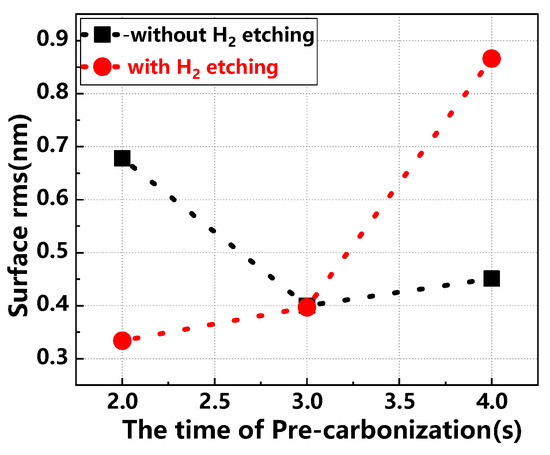 Surface rms values of the buffer layer for different pre-carbonization times, with and without H2 etching conditions.