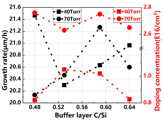 Growth rate and doping concentration of epitaxial layers at different buffer layer C/Si ratios and growth pressures.