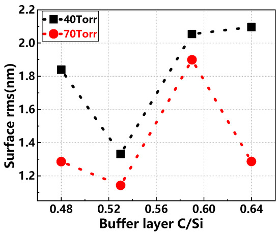 Figure 9 presents the surface rms values of the epitaxial layer under varying buffer layer C/Si ratios and growth pressures. When the buffer layer C/Si ratio is below 0.58, the surface rms follows a similar pattern at both 40 Torr and 70 Torr, initially decreasing and then increasing. As the C/Si ratio increases beyond 0.58, the surface rms remains stable at 40 Torr but continues to decrease at 70 Torr. These observations highlight the substantial impact of the buffer layer C/Si ratio on the epitaxial layer’s surface quality. Adjusting the C/Si ratio can significantly enhance epitaxial wafer uniformity. Furthermore, at 70 Torr, changes in the buffer layer C/Si ratio have a less pronounced effect on the epitaxial layer, facilitating better uniformity, whereas at 40 Torr, its influence is more marked [27,28].