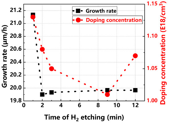 Epitaxial layer growth rate and doping concentration at different H2 etching times.