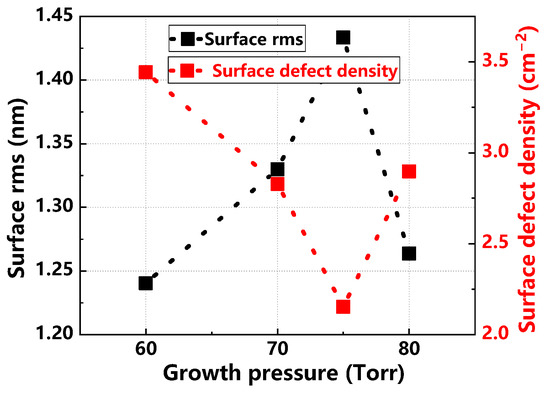 Figure 15 illustrates how the surface rms and surface defect density of the epitaxial layer vary under different growth pressures. As growth pressure increases, the surface rms value initially enlarges and then reduces, while surface defect density decreases and subsequently increases. Optimal conditions, with lower surface rms and defect density, are observed at a growth pressure of 70 Torr, where the epitaxial wafers exhibit the highest quality [31,32,33].