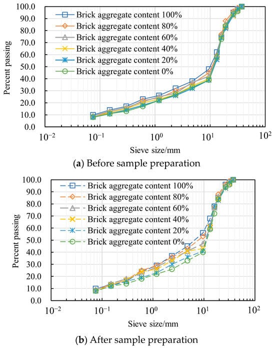 To analyze the stability of mixed recycled aggregate from construction solid waste during the preparation process of CBR specimens, screening tests were conducted on recycled aggregate with different brick aggregate contents, and the impact of brick aggregate crushing characteristics on the gradation of the mixed recycled aggregates during compaction was evaluated. Figure 3 shows the grading curves before and after sample preparation. It can be seen that, when the brick aggregate content was less than 80%, it had little influence on the gradation of the mixed recycled solid-waste aggregate before sample preparation, but, when it was greater than 80%, the pass rate of the 9.5 mm sieve was relatively high, which indicated that its gradation was relatively fine. It was not difficult to find that the gradation change was not evident in the compaction process when the brick aggregate content was 0. With an increase in brick aggregate content, the passing percent of the 9.5 mm sieve and the degree of change in gradation increased. When the brick aggregate content was 100%, the passing percentage of the 9.5 mm sieve increased by around 10%.