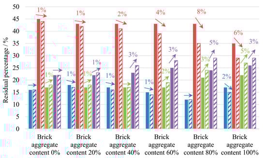 Each mixed recycled aggregate sample was divided into four parts according to particle size, i.e., between 19 and 37.5 mm, 9.5–19 mm, 1.18–9.5 mm, and 0.075–1.18 mm, and the residual percentage variation was analyzed. As shown in Figure 4, when the brick aggregate content was less than 40%, the residual percentage variation of aggregates with size greater than 19 mm was relatively small and that of aggregates with size less than 9.5 mm was relatively stable. On the contrary, with the increase in brick aggregate content, the residual percentage variation of aggregates with size less than 9.5 mm increased gradually and that of 9.5–19 mm recycled aggregate was reduced, which indicated that the aggregate was crushed to a higher degree during the compaction process. The results show that a greater content of brick aggregate led to a greater change in its residual percentage.