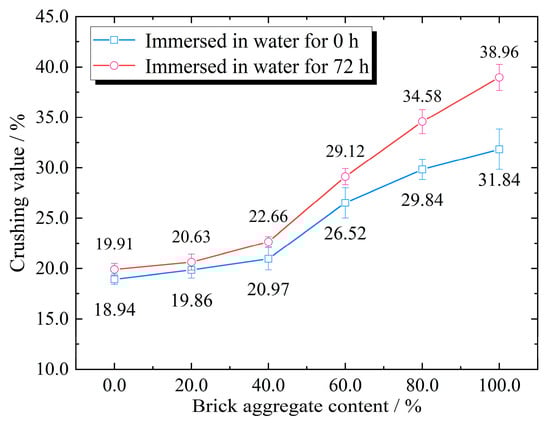 In previous studies, the water absorption characteristics of recycled aggregate have been evaluated [33,34], but the influence of water immersion on the mechanical properties of recycled aggregate has not. In this study, the crushing value test was conducted on the recycled aggregates after immersion. Because the properties of brick aggregate are easily affected by water, the soaking crushing value of the brick aggregate was analyzed after 72 h. As shown in Figure 5, when the mixed recycled aggregate did not contain brick aggregate, the soaking crushing value only increased by around 1%. Since the strength of brick aggregate is low after water absorption, the strength decrease in the samples was more evident when the content of brick aggregate was increased. Therefore, when the brick aggregate content was 100%, the soaking crushing value increased by around 7%, which indicates that a greater brick aggregate content corresponded with a greater influence of soaking on the crushing value. Measures should be taken to improve the moisture resistance of subgrade recycled aggregate. Consistent with the change characteristics of the crushing value in the dry state, when the content of brick aggregate was 40%, was that the crushing value had a noticeable inflection point. To ensure mixed recycled aggregate compressive strength, it is recommended that the content of brick aggregate not exceed 40%.