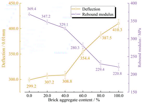 The resilient modulus and deflection of the test section with different brick slag contents were obtained, and the results are shown in Figure 7. It was found that, with the increase in brick slag content, the resilient modulus decreased, and the deflection increased. The reason for this finding is that the brick aggregate was crushed under the action of the dynamic load, and the greater its content, the higher the degree of crushing. In the crushing process, the relative displacement between the particles was large, which led to the increase in deflection and the decrease in resilient modulus.