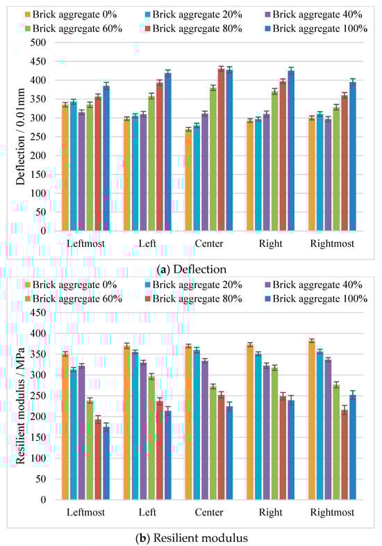 In order to analyze the construction uniformity of the mixed recycled aggregates, we obtained the deflection and resilient modulus at different transverse locations at distances of 2.85 m, 8.55 m, 14.25 m, 19.95 m, and 25.65 m from the subgrade edge, representing the leftmost, slightly left, center, slightly right, and rightmost portions of the subgrade, respectively. As shown in Figure 8a, compared with the subgrade center, the deflection on both sides of the subgrade was slightly greater when the brick aggregate content was less than 20% and smaller when the brick aggregate content was greater than 60%; finally, when the brick aggregate content was 40%, the deflection at different distances from the subgrade edge was nearly the same, which indicates that the construction uniformity was high. The measured deflection value at the edge of the subgrade did not increase strictly with an increase in brick aggregate content, which indicates that the construction uniformity at the subgrade edge was more discrete.