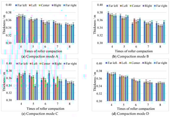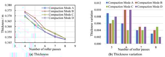 The variation in fill thickness after each pass was calculated. As shown in Figure 9b, when Mode A was applied in the process of compaction, the variation in layer thickness decreased with the increase in the number of passes, which indicates that it became more and more stable. When Modes B and D were applied, the layer thickness first increased and then decreased with the increase in passes, and the layer thickness changed the most after the sixth pass. The layer thickness variation under Modes D and B was inconsistent after the fifth and eighth passes, where Mode D caused a greater change in layer thickness after the fifth pass but a smaller one after the eighth pass of only 2 mm. The layer thickness under Mode C showed the smallest change after the sixth pass and then did not decrease with the increase in passes. The results of the thickness change show that the construction effects of Modes A and D were better.
