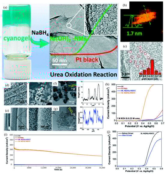 The UOR activity of catalysts is strongly affected by factors such as specific surface area and active site quantity, often addressed through the design of catalyst shapes to optimize material geometry. The nanosheet structure is a typical representative of a high surface area. Ding et al. [51] synthesized Ni(OH)2 nanosheets with an atomic thickness of 1.7 nm, atomic force microscopy (AFM) analysis, and high-resolution transmission electron microscopy (HR-TEM) indicated that the acquired Ni(OH)2-NMs exhibit a substantial surface area along with multiple nanopores, providing highly active catalytic sites and good mass transfer, demonstrating excellent electrocatalytic UOR activity (Figure 2a–c). Lin et al. [52] employed methanol-guided in situ synthesis to fabricate single-layer α-Ni(OH)2 (SL α-Ni(OH)2) on carbon cloth (CC) with a thickness of only ~0.8 nm. Taking advantage of the excellent conductivity of CC (Figure 2d–g), they demonstrated exceptional UOR performance through linear sweep voltammetry, achieving a current density of 436.4 mA cm−2 at 0.5 V vs. Ag/AgCl (Figure 2h). Moreover, thanks to the formation of a 3D porous structure, SL α-Ni(OH)2 NS/CC has not only excellent UOR activity but also good stability. Compared with ML α-Ni(OH)2 NS/CC, after 36,000 s chronoamperometric (CA) testing, SL α-Ni(OH)2 NS/CC achieved 131 times time enhancement (Figure 2i,j).