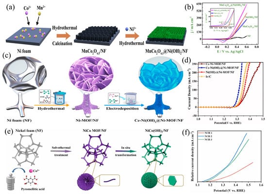 (a) Scheme of the synthesis and (b) CV of MnCo2O4.5@Ni(OH)2/NF, reprinted with permission from Ref. [53]. Copyright 2020, Elsevier. (c) Schematic diagram of the synthesis process of Ce-Ni(OH)2@Ni-MOF/NF and (d) LSV of different samples, reprinted with permission from Ref. [54]. Copyright 2024, Elsevier. (e) Illustration for the synthesis of nickel cobalt hydroxide and (f) LSV of nickel cobalt hydroxide, reprinted with permission from Ref. [55]. Copyright 2023, Elsevier.