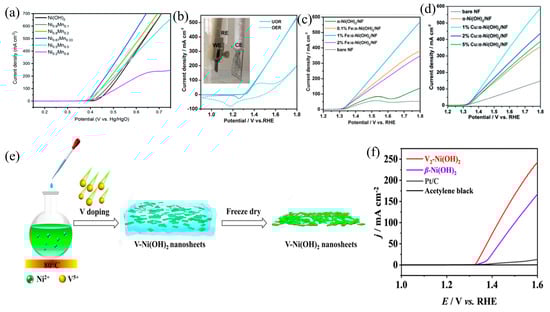 (a) LSV curves of different catalysts, reprinted with permission from Ref. [68]. Copyright 2022, The Royal Society of Chemistry. (b) OER and UOR curves for 1%Fe-Ni(OH)2, (c) LSV curves of α-Ni(OH)2 at different Fe doping concentrations, reprinted with permission from Ref. [63]. Copyright 2018, Wiley-VCH. (d) LSV curves of Cu-incorporated α-Ni(OH)2/NF, reprinted with permission from Ref. [71]. Copyright 2019, The Royal Society of Chemistry. (e) Scheme of the V2-Ni(OH)2 and (f) LSV curves of V2-Ni(OH)2, reprinted with permission from Ref. [72]. Copyright 2022, Elsevier.