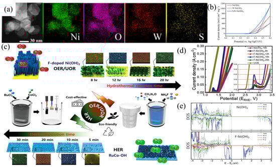Yang et al. [75] incorporated sulfur into Ni(OH)2, creating a catalyst with a lamellar structure and a substantial BET surface area. The sulfur doping enhances both charge transfer and urea adsorption capabilities, resulting in outstanding performance in UOR (Figure 7a,b). Patil et al. [76] employed an ecologically friendly one-step synthesis method to successfully fabricate self-supporting, fluorine-modified 2D nanosheets composed of ultrafine Ni(OH)2, replacing outdated high-vacuum and high-temperature processes (Figure 7c). The heterogeneous catalyst demonstrated heightened redox activity and conductivity, coupled with a substantial presence of readily accessible active sites, enhancing charge transfer in electrocatalytic reactions. DFT calculations revealed a significant increase in the density of Ni atom d-orbitals near the Fermi level, suggesting that F-doping in the Ni(OH)2 catalyst resulted in a finely tuned electronic surface structure and increased conductivity due to the generated defect levels. Furthermore, the introduction of oxygen vacancies into the catalytic material lattice resulted in the revelation of more active sites on the catalyst surface, thereby further influencing electrocatalytic performance. The prepared catalyst demonstrated exceptional UOR activity (Figure 7d,e).