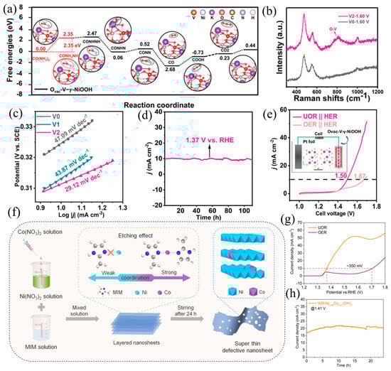 In-situ Raman spectroscopy unveiled structural disorder and diminished crystallinity resulting from vanadium doping. Throughout the electrochemical reconstruction process, alterations in the Raman peak intensity ratio indicated the formation of γ-NiOOH (Figure 9a,b). Utilizing the synergistic effects of doping and vacancies, the NiOOH catalyst demonstrated a reduced reaction barrier (decreasing from 3.48 to 2.35 eV), showcasing enhanced reaction kinetics and persistent UOR activity. The stability of V2 in UOR is further underscored by its significantly lower Tafel slope of 29.12 mV dec−1, in contrast to V0 (47.09 mV dec−1) and V1 (43.87 mV dec−1) in a 1.0 M KOH and 0.33 M urea (Figure 9c,d). In addition, the authors applied the prepared catalyst to the electrolysis of urea and water (with Pt as the cathode) in practical applications. When the current density of the urea electrolysis system reached 10 mA cm−2, the cell voltage was only 1.5 V, significantly lower than the 1.67 V required by traditional water electrolysis systems, thereby saving energy in the electrolysis of water for H2 production (Figure 9e). This work underscores that dual-center engineering involving heteroatom doping and vacancies serves to bridge the gap between selective design and catalyst surface science. Liu et al. [83] employed a dual solvent system, combining water and methanol for the first time. They utilized minute quantities of cobalt doping to initiate defect engineering in α-Ni(OH)2, resulting in the synthesis of co-doped α-Ni(OH)2 (WM-Ni1−xCox(OH)2, Figure 9f). The comprehensive physical characterization of WMNi0.99Co0.01(OH)2 revealed a pronounced abundance of defects compared to the original catalyst. The strategic combination of co-doping and defects efficiently fine-tuned the electronic structure, facilitating the formation of Ni3+, which is a crucial aspect in mitigating overpotential during the UOR. Subtle alterations in surface chemical states induced a notable reduction in the bandgap, accompanied by a significant increase in the specific surface area from 68 to 172.3 m2 g−1. As a result, WM-Ni0.99Co0.01(OH)2 demonstrated a substantial reduction of nearly 110 mV (1.47 V vs. RHE) at a current density of 10 mA cm−2 and exhibited enduring stability during 24 h of continuous operation (Figure 9g,h). Precision control over the location and concentration of defects enables the tailored design of UOR catalysts with strengthened catalytic activity.