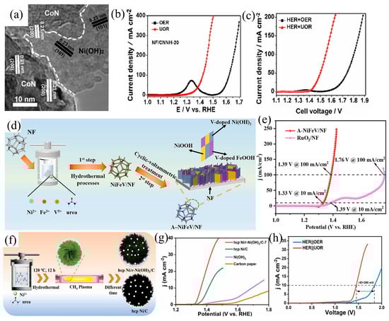 (a) HRTEM image of CoN/Ni(OH)2, (b) LSV of CoN/Ni(OH)2, and (c) LSV of CoN/Ni(OH)2 for overall water electrolysis and urea electrolysis, reprinted with permission from Ref. [89]. Copyright 2020, Elsevier. (d) Scheme of the NiFeV/NF, (e) LSV of NiFeV/NF, reprinted with permission from Ref. [91]. Copyright 2024, Elsevier. (f) Schematic illustration of the formation of Ni/r-Ni(OH)2, (g) LSV of different catalysts, and (h) polarization curves of Ni/r-Ni(OH)2/C electrocatalysts in urea and water electrolysis, reprinted with permission from Ref. [92]. Copyright 2023, Elsevier.