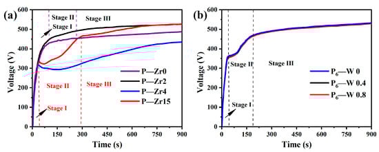Time–voltage response curve of the aluminum alloy micro-arc oxidation process: (a) after adding K2ZrF6; (b) after adding Na2WO4.