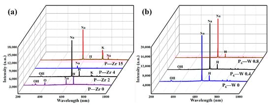 Based on the micro-arc oxidation time–voltage curve, a point was selected at the third stage of micro-arc oxidation (300th s of the large spark stage). The discharged sparks generated during the process were captured, and the discharged ions were analyzed using optical emission spectroscopy (OES) between 200 and 1000 nm. Figure 2a shows the OES spectra of the four solutions after adding K2ZrF6. The discharge intensity of the electrolyte solution first increases, then decreases, and finally increases with the addition of different K2ZrF6 content, consistent with the trend of its operating voltage. Comparing the solutions with and without K2ZrF6 reveals that during discharging, not only the strong discharge of Na 589.46 nm is present, but also K 767.11 nm is involved in the discharge reaction. This indicates that the electrolyte is primarily consumed during the discharge process. The absence of an Al peak in the spectra further suggests that the substrate is seldom consumed in the energy supply discharge. Additionally, Hα 656.41 nm in the electrolyte also participates in the reaction, which is related to the acidic nature of the solution after the hydrolysis of K2ZrF6. Figure 2b shows the OES spectra after adding a small amount of Na2WO4. The spectra stabilize due to the low Na2WO4 content and the lack of obvious voltage changes during the discharge process. The presence of strong Na peaks further indicates that the discharge process mainly consumes the electrolyte.