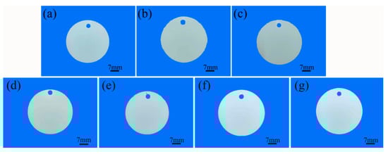 Comparison of the macroscopic morphologies of the aluminum alloy micro-arc oxidation coatings with different additives: (a) P6—W 0, (b) P6—W 0.4, (c) P6—W 0.8, (d) P—Zr 0, (e) P—Zr 2, (f) P—Zr 4, and (g) P—Zr 15.