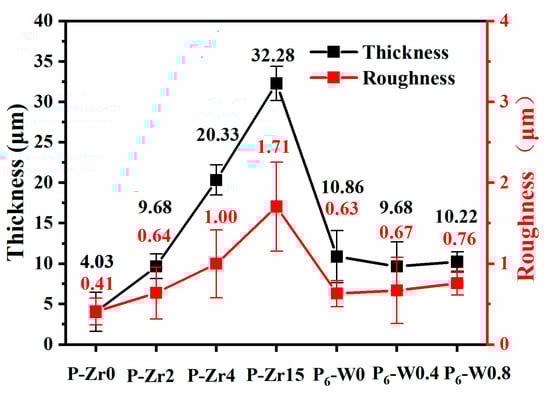 Figure 4 illustrates the relationship between the thickness and roughness of the aluminum alloy micro-arc oxidation coatings with different additives. It was observed that with an increasing K2ZrF6 concentration, the thickness of the micro-arc oxidation coating under the same electric parameters increased, indicating that zirconium ions participated in the reaction and were incorporated into the coating. K2ZrF6 fully dissolved, further suggesting that K2ZrF6 promotes coating growth. The increase in thickness also led to an increase in coating roughness, and the changing trend of roughness was consistent with the changing trend of thickness, as evident in the figure. This demonstrates that within the same electrolyte, the coating thickness is a direct factor affecting the surface roughness of the coating. Simultaneously, due to the low Na2WO4 content and the same working voltage, no obvious changes in coating thickness or roughness were observed.