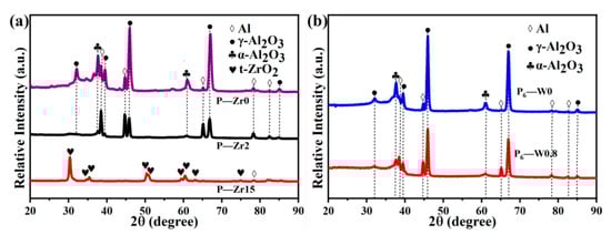 Figure 5 shows the results of the physical phase analysis of the micro-arc oxidation coatings prepared with different additives. From Figure 5a, it can be seen that the main phase compositions of the coatings without the addition of K2ZrF6 are α-Al2O3 and γ-Al2O3, with a small amount of the Al substrate diffraction peaks also present. This is because the micro-arc oxidation coating has a loose, porous structure, and the X-rays pass through the pores on the coating surface, revealing the diffraction peaks of the Al substrate. With the addition of K2ZrF6, a gradual decrease in α-Al2O3 and γ-Al2O3 is clearly observed, indicating that the addition of K2ZrF6 reduces the consumption of the Al substrate. When the K2ZrF6 content reached 15 g/L, α-Al2O3 and γ-Al2O3 completely disappeared, as the increase in the K2ZrF6 content completely suppressed the depletion of the Al substrate. All the Zr in the coatings came from the electrolyte, and tetragonal zirconia (t-ZrO2) appeared, which was the reason for the increase in the L* values of the coatings. This further demonstrates that the presence of additives in the micro-arc oxidation process inhibits substrate depletion, and the coating growth is mainly derived from the deposition of electrolyte compounds, with the coating growth mode dominated by deposition. Moreover, the thickening of the coating has a shielding effect, which reduces the Al diffraction peaks. Figure 5b shows the change in the coating phase composition after adding Na2WO4. Due to the small content of the additive, Na2WO4 could not affect the coating phase composition, and the coating maintained α-Al2O3 and γ-Al2O3 as the main crystalline phases.