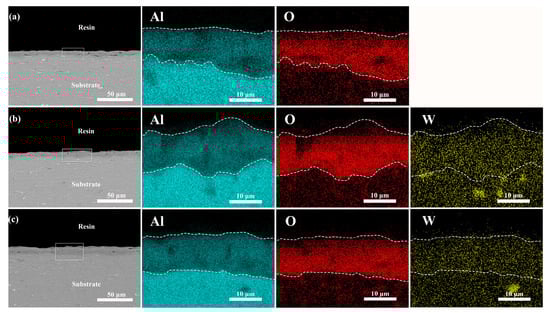 Cross-sectional elemental distribution of the aluminum alloy micro-arc oxidation coatings after 15 min at different Na2WO4 contents: (a) P6—W 0, (b) P6—W 0.4, (c) P6—W 0.8.