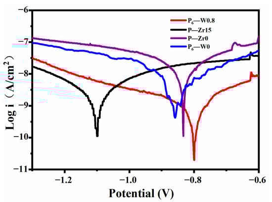 Figure 12 presents the kinetic potential polarization curves measured in a 3.5% NaCl solution at room temperature for samples with and without additives after micro-arc oxidation. Table 5 lists the fitting results of the corrosion potential (Ecorr) and corrosion current density (icorr). In general, the corrosion potential reflects the coating’s stability; a more positive corrosion potential indicates a more stable coating. The corrosion current density reflects the coating’s corrosion rate; a lower corrosion current density corresponds to a more corrosion-resistant coating. The Ecorr is typically related to the material’s thermodynamic stability, and a lower Ecorr value suggests a higher susceptibility to localized corrosion [22]. The addition of Na2WO4 resulted in a 53 mV increase in the Ecorr compared to P6-W0, which may be attributed to the increased crystallinity of the coating. Furthermore, the icorr value decreased after the addition of Na2WO4, indicating the improved corrosion resistance of the coatings. The addition of K2ZrF6 also led to a one-order-of-magnitude decrease in the corrosion current density (icorr), which is due to the increased coating thickness and the consequent slowing of the corrosion rate, resulting in better corrosion protection performance. However, the corrosion potential (Ecorr) decreased by 268 mV, and the cross-sectional morphology of the coatings revealed a loose and porous structure after the addition of K2ZrF6, making them more susceptible to corrosion. The increased thickness contributed to the enhanced corrosion resistance of the coating in the same environment [23].