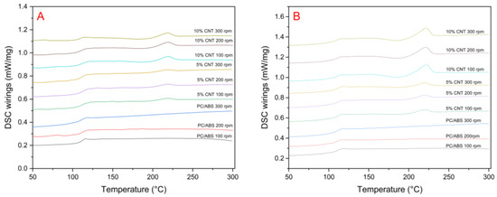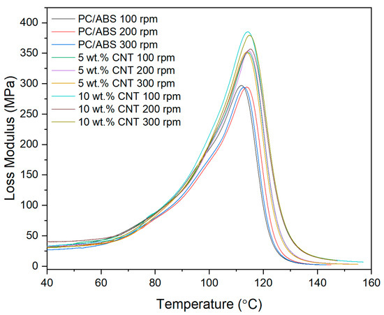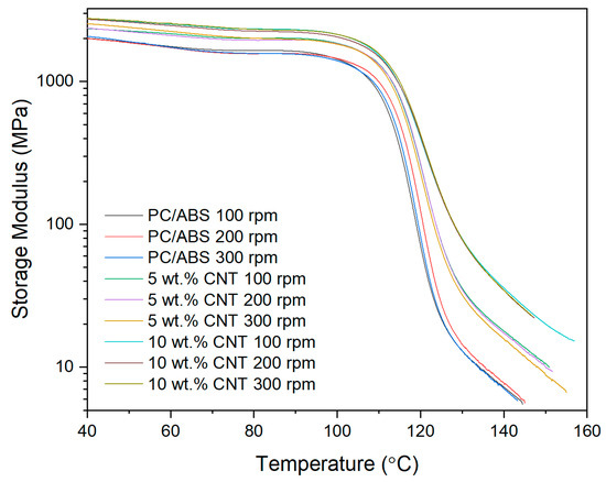 23]. The introduction of CNTs into the PC/ABS matrix increased the PNCs’ ability to store energy elastically during deformation. The storage modulus of a PNC is highly affected by the composition and the interfacial adhesion between matrixes [