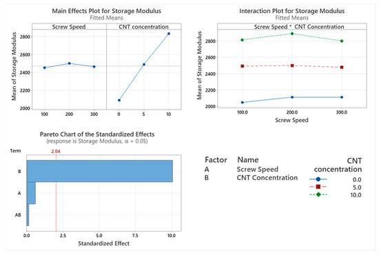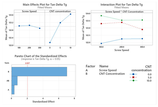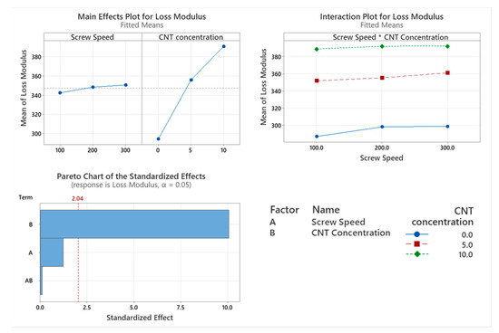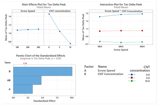Screw speed and the interaction between the two factors also significantly affected the damping factor of the PNC. Increasing the screw speed while compounding saw an increase in the damping factor however the lowest damping factor of the PNCs was that of the 10 wt.% CNT compounded at 200 rpm, with an increase in the damping factor when compounding at 300 rpm. The lowering of the damping factor indicates good interfacial adhesion between the CNTs and the PC/ABS matrix [