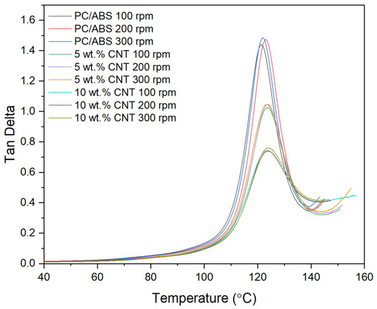 27]. The introduction of CNTs to the PC/ABS matrix has improved the viscoelastic properties of the PNC, with CNT concentration significantly affecting the Tan delta peak of the PNC. A lower Tan delta peak indicates a higher stored-to-loss energy ratio at the Tg. The reduction in the Tan delta peak (damping factor) with the increasing concentration of CNTs may relate to a strong hindrance in chain mobility caused by the entangled CNT networks [