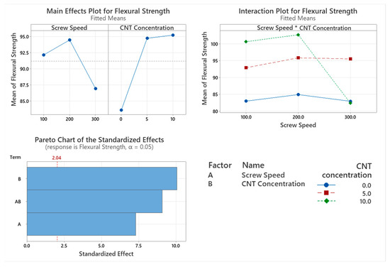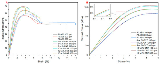 34]. This reduction in flexural properties may be attributed to shear degradation at high screw speeds and CNT concentration. The highest flexural strength was observed at 10 wt.% compounded at 200 rpm.