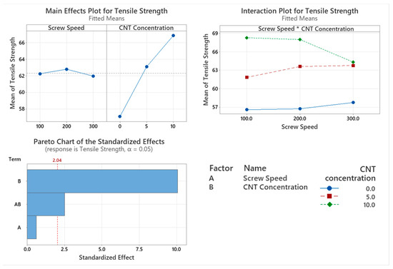 p-value nears 0.05 which would suggest that more samples may be required to determine its significance. Similar to the tensile modulus, the tensile strength of the PNC saw an incremental increase with increasing CNT concentration. CNT concentration is a significant factor that affects the tensile strength of the PNC. Screw speed is not a significant factor that affects the tensile strength of the PNC however, the interaction between the two factors is significant. This can be seen in