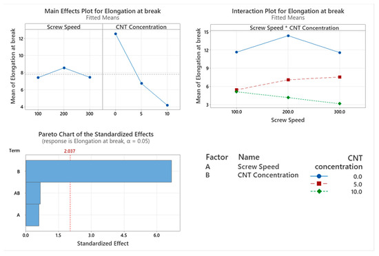 Figure 12, where the tensile strength of the 10 wt.% CNT compounded at 300 rpm sees a significant drop compared to the other compounding screw speeds. This could be attributed to shear degradation occurring at the highest screw speed or excessive chain alignment causing a reduction in ductility. As stiffness increases, with increasing CNT content, a reduction in elongation at break occurs. Increased CNT concentration causes a significant reduction in the elongation at the break of the PNCs. It is widely reported that nanofillers act as nucleating agents, which increase crystallinity and, thereby the elongation at break. With the opposite observed in this work, it is likely that shear degradation of the polymer chain is the predominant factor. This is in agreement with findings from Charpy impact testing, where increasing CNT concentrations, agglomerates of CNTs formed, which increased the brittleness of the PNC [