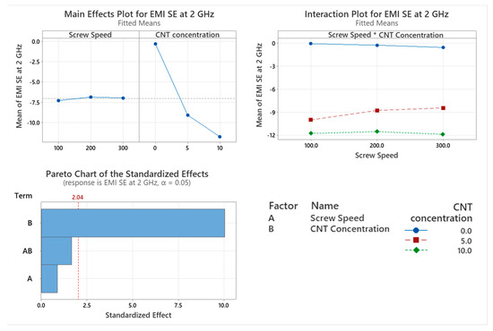 For EMI SE, the only significant factor that affects it is the CNT concentration. The highest level of CNT concentration achieves the best shielding at 2 GHz. Screw speed is not a significant factor that affects the EMI SE of a PNC. There is little to no attenuation occurring with the base polymer; however, it was observed that with the inclusion of CNTs, the attenuation increases. This was due to the CNT concentration being above the percolation threshold range of 0.5 to 4.5 wt.%. Above this range, the CNTs create a conductive network throughout the polymer matrix [