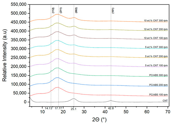 X-ray Diffraction (XRD) was used to identify the crystalline phases present in the material and the ways in which the addition of CNTs to the PC/ABS affected their crystallinity. Testing was conducted in triplicate with a Malvern Panalytical Aeris Diffractometer (Malvern Panalytical Ltd., Almelo, The Netherlands) from 4 to 70° with a step size of 0.043° 2θ and a scan speed of 0.055 ° s−1.