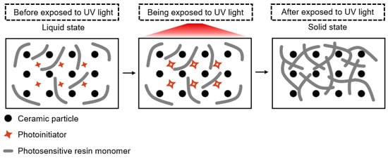 Before discussing any issues related to the ceramic VP process, it is important to first understand the raw material composition and curing mechanism inherent to it. Ceramic VP slurries typically comprise ceramic particles, photosensitive resin monomers (and/or oligomers) with functional groups, photoinitiators, dispersants, and other additives [58]. Figure 1 depicts a comprehensive overview of the composition of the ceramic VP slurry and the UV light-curing process. The ceramic particles remain in a relatively stable state within the photosensitive resin in the presence of dispersants, which makes the whole system behave as a suspension with a certain viscosity [59,60]. The photoinitiator plays a crucial role in enabling light-induced curing within this suspension system. When exposed to UV light, the photoinitiator undergoes activation, initiating cross-linking polymerization of the photosensitive resin [61]. Concurrently, the ceramic particles become encapsulated within the polymer matrix, resulting in the formation of ceramic green parts. This process primarily involves a chain polymerization reaction of the photosensitive resin monomers. To facilitate comprehension of this process, it is delineated below into three key steps: chain initiation, chain polymerization, and chain termination.