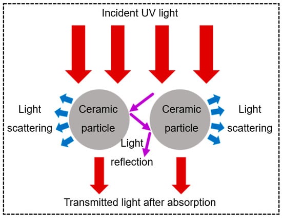As shown in Figure 2, these interactions encompass light absorption, light scattering, light reflection, and light transmission, with reflection representing a distinct manifestation of scattering. The absorption, scattering, and reflection of light by ceramic particles collectively influence the transmission and penetration depth of UV light, which is reflected as and in Equation (5). Section 3.1 discusses the light absorption by ceramic particles. Increased light absorption by ceramic particles correlates with diminished UV light penetration depths. Concurrently, the competition between light absorption by ceramic particles and the photoinitiator diminishes the energy available for photoinitiator excitation, potentially resulting in a reduced curing thickness of the ceramic VP slurry. Section 3.2 addresses the light scattering by ceramic particles. Pronounced scattering not only engenders light energy loss but also induces blurring at the cured area periphery, thereby compromising the resolution of the ceramic VP process. Subsequently, Section 3.3 elucidates the light reflection by ceramic particles. An elevated intensity of reflected light on ceramic particle surfaces, coupled with low impediments to further light propagation, augments the UV light penetration depth within the ceramic VP slurry, consequently enhancing the curing thickness.