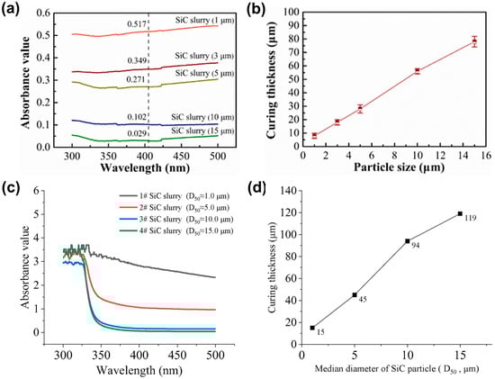 Some researchers have optimized the light-curing behavior of non-oxide ceramic slurries based on the approach of adjusting the ceramic particle size. Specifically, Ding et al. [49] prepared VP slurries with a solid loading of 30 vol% by utilizing SiC particles of different sizes (1, 3, 5, 10, and 15 µm). The absorbance values and curing thicknesses of the SiC slurries with different particle sizes are shown in Figure 3a,b. It was observed that the absorbance values significantly increased as the particle size decreased, while the curing thickness decreased accordingly. At a particle size of 15 µm, the slurry achieved a curing thickness of 78 μm. However, when using fine particles with a size of only 1 µm, the resulting curing thickness was only approximately 8 μm. Similarly, Hu et al. [81] formulated VP slurries with a solid loading of 40 vol% using SiC particles with D50 values of 1, 5, 10, and 15 µm and obtained analogous conclusions. Figure 3c,d illustrate the absorbance values and curing thickness of SiC slurries with different particle sizes. With an increase in particle size, the curing thickness of the slurry also increased, ranging from 15 µm to 119 µm. These results indicate that larger particle sizes diminish the extinction capacity of the solid phase.