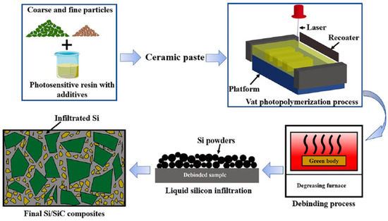 As mentioned above, it is not recommended to use either coarse or fine particles alone as raw materials for non-oxide ceramic VP slurries. Several researchers have investigated the effects of particle gradation, i.e., the utilization of a combination of coarse and fine particles, in a certain ratio. For example, Tang et al. [86] employed two SiC particle sizes with D50 values of 58,626 µm and 3289 µm for grading. In addition, they incorporated carbomer as a thickener. The addition of a thickener is imperative to ensure the suspension stability of the larger particles within the slurry and prevent their settling, despite being rarely utilized in other non-oxide ceramic VP slurry formulations. This SiC VP slurry has a high solid loading of 60 vol%. However, the curing thickness can reach up to 130 μm. The utilization of particle grading enables the inclusion of larger particle sizes, thereby further diminishing the extinction capacity of the solid phase while maintaining a high solid loading. However, the oversized particles significantly impeded sintering activity. Therefore, the LSI process was employed to ensure the dense sintering of the products. Eventually, Si/SiC composites were prepared. Figure 4 is the schematic diagram of the preparation process of Si/SiC composites utilizing a particle-graded slurry and LSI process.