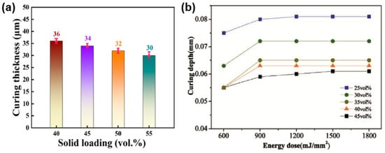 Numerous studies focusing on the VP process of non-oxide ceramics have consistently corroborated the assertion that reducing the solid loading of the slurry leads to an increase in the curing thickness. For instance, Dong et al. [50] prepared Si3N4 slurries with solid loading of 40, 45, 50, and 55 vol%. These slurries were exposed to a light intensity of 10,000 μW/cm2 for a duration of 6 s. As the solid loading increased, the curing thickness of the slurry decreased from 36 µm to 30 µm. Similarly, Liu et al. [56] developed Si3N4 slurries with solid loading varying from 25 vol% to 45 vol% and analyzed the resulting curing thickness. They concluded that there was an inverse relationship between the solid loading and the curing thickness, as shown in Figure 5a,b.
