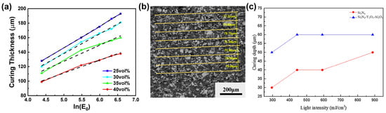 Equation (12) states that reducing the volume fraction of ceramic particles leads to an increase in the curing thickness. There are a few reasons for this effect. Firstly, when the volume fraction of ceramic particles decreases, more light can be absorbed by the photoinitiators. This results in the generation of more reactive radicals or cations, which promotes the curing reaction and increases the curing thickness. Secondly, with a lower volume fraction of ceramic particles, there is less “blockage” of light as it travels through the suspension. The absorption, scattering, and refraction of light by the ceramic particles become weaker, which allows for increased penetration of light into the slurry and further contributes to the increase in curing thickness.