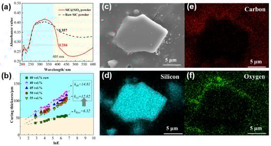 While the introduction of a significant number of oxide ceramic particles has been shown to improve curing behavior, this approach results in a residual oxide ceramic phase that can be difficult to remove using subsequent processes [86]. To reduce the oxide ceramic phase residue while maintaining a desired curing thickness, researchers have explored the application of surface coatings on non-oxidized particles. For instance, Cao et al. [100] subjected 10 µm SiC particles to oxidation at 1200 °C for 4 h, resulting in the formation of SiC@SiO2 core–shell-structured particles with an unchanged particle size. Figure 7a illustrates the absorbance value of raw SiC and pre-oxidized SiC@SiO2 ceramic particles. The SiO2 shell layer effectively reduced the particle absorbance from 0.357 to 0.284. As shown in Figure 7b, the slurry formulated with untreated SiC particles exhibited a curing thickness of only around 50 μm at a solids content of 40 vol%. In contrast, the slurry formulated with SiC@SiO2 particles achieved a curing thickness of up to 120 μm. Even if the solid loading is increased to 55 vol%, the curing thickness can still be as high as about 100 μm. Figure 7c–f illustrate the SEM micrograph and EDS analysis of SiC particles after oxidation. They show that a SiO2 layer with a thickness of less than 1 μm was formed on the surface of SiC particle, as evidenced by the distribution of oxygen elements in Figure 7f.