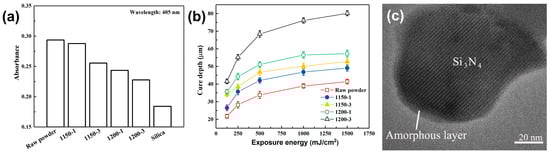 In addition, Huang et al. [101] successfully synthesized Si3N4@SiO2 core–shell-structured particles by oxidizing Si3N4 particles at different temperatures and durations (1150 °C for 1 h and 1200 °C for 3 h). With increased oxidation, the particle absorbance decreased from approximately 0.3 to around 0.23, while the maximum curing thickness rose from less than 40 μm to about 80 μm, as shown in Figure 8a,b. Notably, Figure 8c illustrates that the SiO2 shell layer had a thickness in the nanometer range. It is clear that the sub-micron/nano-scale thickness of the oxide shell contributes to the improvement of the curing behavior of non-oxide ceramic VP slurry while significantly reducing the amount of impurities introduced into the slurry.