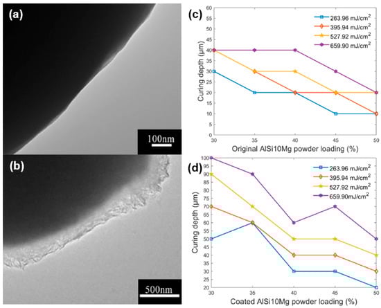 TEM micrograph for (a) the original AlSi10Mg particle and (b) the polystyrene–AlSi10Mg composite particle. Curing depth of slurries with different particles, (c) original AlSi10Mg particles and (d) polystyrene–AlSi10Mg composite particles. Adapted from ref. [102].