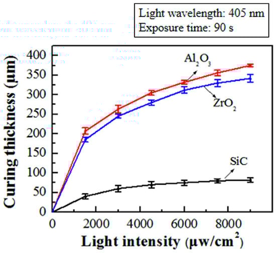 Ding et al. [49] configured VP slurries with a solid loading of 30 vol% using Al2O3, ZrO2, and SiC and investigated the relationship between light intensity and curing thickness. As shown in Figure 10, the curing thickness of the SiC slurry was significantly lower than that of the two oxide slurries at the same light intensity. As increased, the curing thickness inevitably experienced some growth. However, once reached a certain threshold, the growth rate diminished significantly and eventually stabilized. Further increasing at this point did not contribute significantly to an improved curing thickness. Moreover, excessively high incident light energy can cause resin carbonization, resulting in failure of the VP process. Additionally, portions of the slurry that have already cured impede light propagation, hindering further curing [49]. Therefore, while initially effective, relying on an increased light intensity to enhance curing thickness quickly loses its effectiveness as light intensity is further increased.