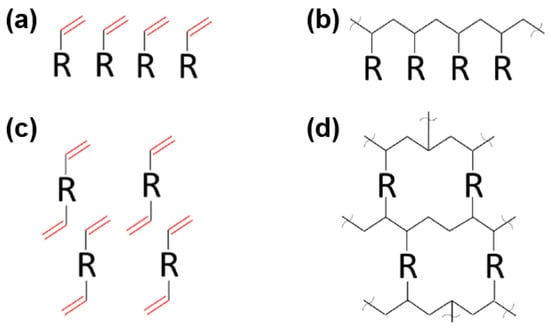 Comparison of mono and multifunctional monomers: (a) monofunctional monomers; (b) linear polymerization of monofunctional monomers; (c) multifunctional monomers; (d) network polymerization of multifunctional monomers. Adapted from ref. [103].