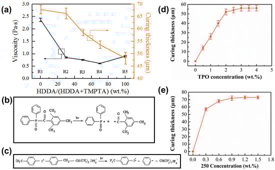 In addition to investigating the impact of resin functionality, Ding et al. [49] also examined the influence of photoinitiator type and dosage on the light-curing behavior of SiC slurries. Two commonly used initiators were selected: TPO, a free radical initiator; and 250, a cationic initiator. Figure 12b,c illustrate the initiate mechanisms for TPO and 250. The slurry containing the cationic initiator 250 exhibited a higher curing thickness compared to the one with TPO. This can be attributed to the fact that the cationic initiator is capable of generating both super-strong protonic acid and active free radicals. These species weaken the oxygen inhibition effect, thereby allowing for a more efficient curing process. In contrast, the free radical initiator may be more susceptible to the inhibitory effects of oxygen, leading to a lower curing thickness. Furthermore, the amount of initiator used in the slurry formulation was found to have an impact on the curing thickness. Figure 12d,e illustrate the effect of initiator (TPO/250) concentration on the curing thickness of a SiC slurry. Initially, as the initiator dosage increased, the curing thickness of the slurry showed a tendency to increase. This can be attributed to the increased availability of reactive species, which promotes a more complete polymerization reaction. However, there may be a saturation point beyond which further increases in initiator dosage do not significantly contribute to the curing thickness. This is because the photoinitiators can only receive a limited amount of light energy, which restricts their overall efficiency.