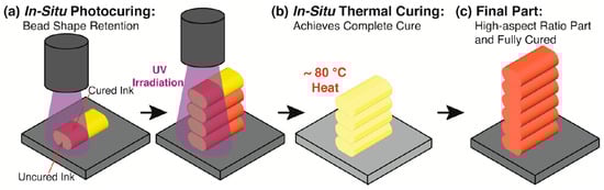 - Rau, D.A.; Bryant, J.S.; Reynolds, J.P.; Bortner, M.J.; Williams, C.B. A dual-cure approach for the ultraviolet-assisted material extrusion of highly loaded opaque suspensions. Addit. Manuf. 2023, 72, 103616. [Google Scholar] [CrossRef]