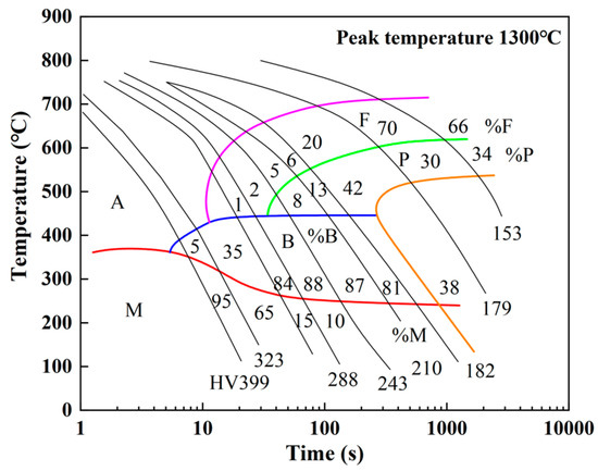 During the cooling stage after welding, supercooled austenite starts to become unstable when the temperature drops below A3, and further cooling results in phase transformation. Figure 5 [25] illustrates the SH-CCT diagram of Q345 steel. The supercooled austenite mainly undergoes ferrite and pearlite phase transformations at lower cooling rates. While at higher cooling rates, it primarily undergoes bainite and martensite phase transformations.