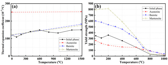 Thermal expansion coefficients and yield strength of each phase (from Ref. [13]): (a) thermal expansion coefficient; (b) yield strength.